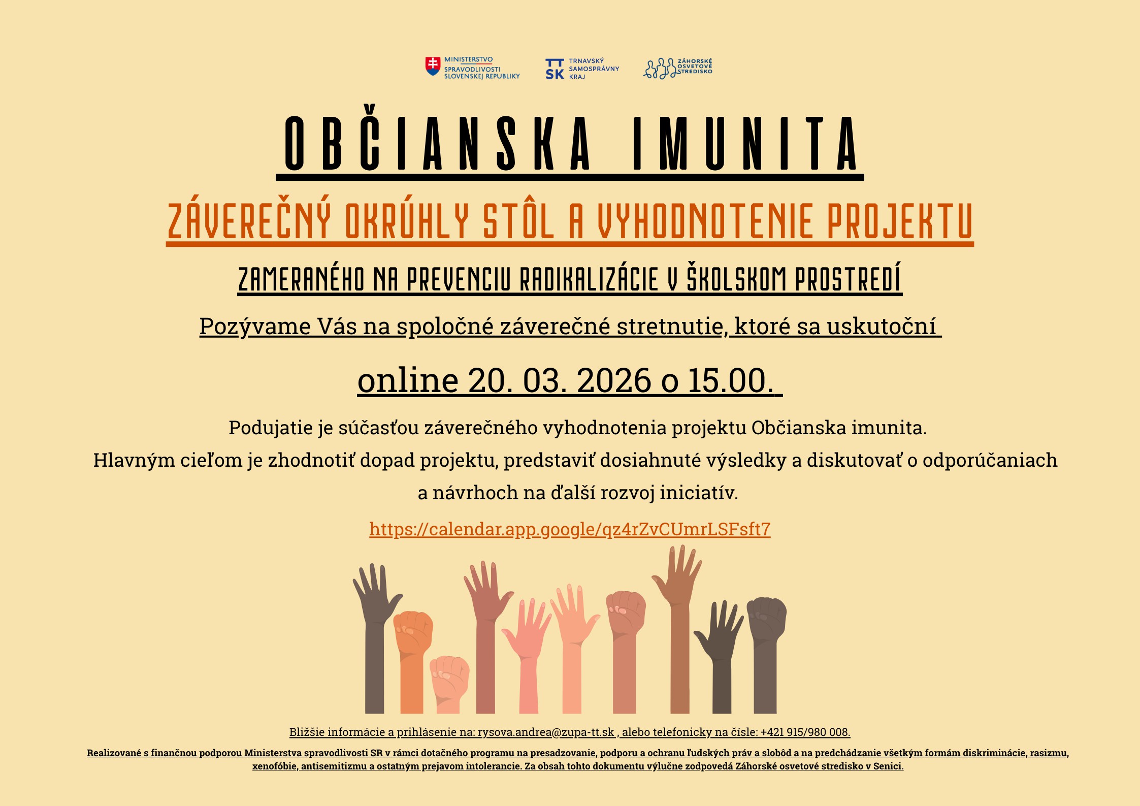 Tento projekt je realizovaný v rámci grantovej výzvy Ministerstva spravodlivosti SR – ĽP 2025 dotácia na presadzovanie, podporu a ochranu ľudských práv a slobôd a na predchádzanie všetkým formám diskriminácie, rasizmu, xenofóbie, antisemitizmu a ostatným prejavom intolerancie.